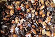 - Chahuis, shahuis, shawis, shahues, chagüis, xohues, xahuis, gusanos de los palos, escarabajos rinoceronte, escarabajo de cuernos largos, escarabajos longicornio, gallinas ciegas, titococos, titocos, canalejos o cuauhocuilin (del náhuatl: "gusanos de la madera") son nombres que hacen referencia a una variedad de 88 especies de escarabajos considerados como alimento para el ser humano.[25] Algunas son endémicas de los estados mexicanos de Puebla, Oaxaca y Veracruz, y comúnmente son escarabajos de las familias: Cerambycidae, Scarabaeidae, Melolonthidae y Passalidae. Así como los géneros Aplagiognathus, especialmente: spinosus (Newman, 1840); Arhophalus, especiamente: rusticus (Linnaeus, 1758); Callipogon, especialmente: barbatum (Fabricius, 1781); Derobrachus, especialmente: procerus, Thomson, 1860); Lagocheirus, especialmente: rogersii (Bates, 1880); Oileus, especialmente: rimator (Truqui, 1857); Melolontha (Fabricius, 1775);. Passalus, especialmente: insterstitialis (Eschscholtz, 1829), punctiger (Lepeletier & Audinet-Serville, 1828) y puntatostriatus (Percheron, 1835); Phyllopaga, especialmente: mexicana, Blanchard, 1851); Polyrhaphis (Audinet-Serville, 1835); Stenodontes, especialmente: cer. maxillosus (Drury, 1773)[26] y cer. molaria (Bates); Trichoderes, especialmente: pini (Chevrolat, 1843) y Xyloryctes, especialmente: corniger y ensifer, ambos por Bates, 1888 y furcata y furcatus, ambos por Burmeister, 1847, entre otros.[21][22][24][27][28][29][30]