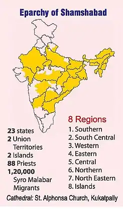 La eparquía extiende su jurisdicción a todos los fieles siro-malabares de la India, no comprendidos en las eparquías existentes al momento de su creación. La eparquía tiene jurisdicción sobre la totalidad o partes de 23 estados y 4 territorios de la India. Se subdivide en 8 regiones:[2]