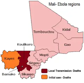 El 23 de octubre de 2014, se confirmó el primer caso de virus del ébola en Malí, una niña de dos años y medio que volvió a Mali procedente de Guinea,[63] tras un viaje de 1200 km entre Bèla, Guinea, y Kayes, Malí. En esta ciudad, la niña fue hospitalizada y falleció el día 24 de octubre.[64] Se realizó un seguimiento a todos las personas que tuvieron contacto con la niña sin que hubiese ningún caso más.[65]