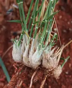 Es una hierba perenne densamente copetuda que puede crecer entre 10 y 60 cm de altura con una base lanosa bulbosa.[1] Los muchos tallos están ramificados con articulaciones sin pelo (nodos). Las cabezas de semillas abiertas tienen entre 9 a 20 cm de largo y están teñidas de color púrpura. Las semillas están espigas de 1 o 2 cm de largo y contienen hasta 20 semillas emparejadas.[cita requerida]