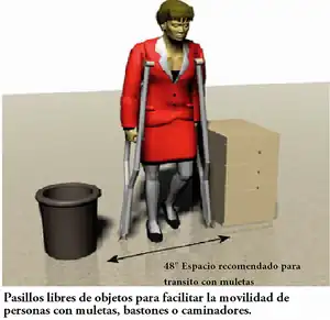 Algunas personas cuando sufren algún accidente o una discapacidad momentánea, necesitan la ayuda de aparatos para caminar, como muletas, bastones o caminadores. Un ancho mínimo de 36" de pared a pared, en un pasillo o en un lugar de trabajo es necesaria para facilitar la movilidad de estas personas. Los estudios han demostrado que 48" es el ancho preferible de pasillo, para las personas que utilizan muletas, bastones o caminadores. También es importante mantener estas zonas libres de obstáculos para evitar el riesgo de una caída y una lesión mayor.[11]