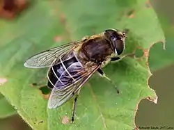 La longitud de las alas es de 8,25 a 10,5 mm (0,325 a 0,413 pulgadas). Los pelos corporales son cortos. La cara densamente empolvada tiene una franja negra brillante. Los tarsos son oscuros. Los fémures posteriores son negros en los machos. El cuerpo posee pelo amarillo.[6][7][8][9]