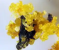 ![]() Cristales de color naranja amarillento del mineral eritrosiderita, extraído de la localidad tipo del Monte Vesubio. | ||