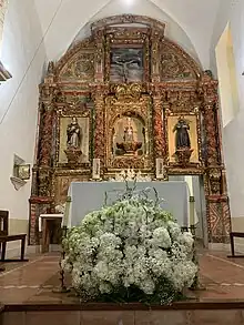 De estilo barroco, dorado y policromado. En el costado derecho de su basamento se abre la puerta de la sacristía; en el izquierdo, buscando simetría con este acceso, se pintó una puerta, con decoración de cuarterones fingidos. Al centro de esta base, una tabla con marco dorado, al igual que las puertas, tuvo un rótulo con las palabras de la consagración. Flanquean este centro y los lados de las puertas (la real y la fingida), las repisas de las cuatro columnas del retablo, decoradas con follaje y las del centro, con cabezas de ángeles.[4]