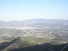 La explanada inferior se han colocado bancos mesas y paelleros para los excursionistas. Desde este lugar el panorama se domina toda la Vall d'Albaida, sierra de Mariola.
