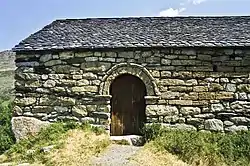 El edificio se asienta sobre rocas irregulares y de notables dimensiones, probablemente procedentes de deslizamientos producidos por la erosión del glaciar que le sirven de base, piedras de la misma naturaleza se extienden alrededor de la iglesia. En la fachada norte se puede ver, no muy lejos del ábside, la marca de una gran arcada de piedra pómez, tapiada y con el empedrado parcialmente reventado, que hace evidente la existencia de una perforación del muro quizá por acceder a una capilla lateral, añadida después de la primera etapa constructiva y suprimida posteriormente. El hecho de que no se vean señales de arranque de los muros podría indicar que dicho anexo habría sido adosado sin encaje en el muro. Los muros, de sillares de piedra, desbastada bastante irregulares, presentan diferencia en su aparato. Parece que la cabecera -el ábside más un tercio aproximadamente de la nave- podría pertenecer a una etapa constructiva anterior a la del resto de la nave, donde los sillares están dispuestos de forma mucho más regular. En el interior, hay un banco corrido lateral construido con sillares de piedra mientras que, el pavimento de la nave, está formado por grandes losas y el del presbiterio está construido por piedras. En el ángulo noroeste de los pies hay una pila bautismal.[2]