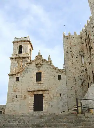 Integrada en el lado del Evangelio de la fachada, se eleva la torre campanario, de planta cuadrada y de dos cuerpos, decorada en el frontis por un gran escudo. La torre, un siglo más adelante será imitada por el campanario del Templo Parroquial de Santa María de Peñíscola.