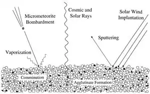 Gran parte del conocimiento sobre los procesos de erosión espacial es resultado del análisis de las muestras lunares recogidas durante el programa Apolo, particularmente los trozos de suelo lunar (o regolitos). El flujo constante de partículas de alta energía y micrometeoritos, junto con meteoritos de mayores dimensiones, actúan conminuyendo, fundiendo, pulverizando y vaporizando los componentes del suelo lunar, como también entremezclándolo y rotándolo.