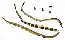 El fruto es una vaina o legumbre derecha, de color marrón oscuro, de 12 cm a 25 cm de largo por 1 cm de ancho, con un apéndice en el ápice y un tallo delgado en la base.[2][3] En su interior contiene semillas de color marrón en forma de riñón, de 1 a 2 cm de largo.[2][3] Sin embargo, el fruto es tóxico para el ganado, lo que restringe su uso.