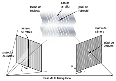 La técnica más rápida y versátil (por lo que a tiempo de captura respecta) es la proyección de patrones bidimensionales como ahora, el patrón de rayas o de reja. La primera (y la más utilizada) consiste en la proyección de multitud de rayas correlativas entre sí o distribuidas arbitrariamente. La segunda proyecta una reja de m*n puntos que iluminan parte del objeto de una sola tirada. Estos dos métodos permiten la adquisición de una gran número de muestras simultáneamente.