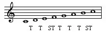 Las escalas mayores de primer tipo resultantes constan, por orden, de los siguientes tonos (T) y semitonos (st): T–T–st–T–T–T–st (dos tonos, semitono, tres tonos, semitono). Aplicando la fórmula anterior para la Escala de Do Mayor, daría como resultado la secuencia: