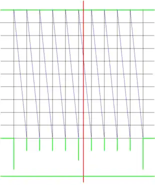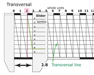 Como se ve en la ilustración, una vez que se ha dibujado la cuadrícula, se trazan las diagonales (escala transversal) en el ejemplo: desde la esquina superior izquierda de una columna de la cuadrícula hasta la esquina inferior opuesta. Esta línea corta las líneas horizontales de la cuadrícula a intervalos iguales. Mediante el uso de un cursor, alidada o indicador de medida, se determina el punto más cercano donde el cursor corta la transversal. La numeración vertical sobre el cursor indica la fracción de división que se está midiendo.