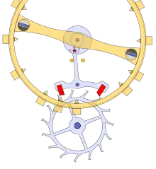 La rueda de escape está acoplada al tren de ruedas del reloj, que le aplica el par del resorte motor. La rotación de la rueda de escape está controlada por las paletas del áncora. La rueda de escape tiene dientes de forma especial, ya sea en forma de trinquete o de bastón, que interactúan con dos piezas de rubí, la paleta de entrada y la de salida. La rueda de escape, salvo en casos excepcionales, tiene 15 dientes y está fabricada en acero. Las paletas están unidas sólidamente a la palanca, que tiene en su extremo una horquilla para recibir el impulso del rubí del eje del rodillo de equilibrio, fijado al eje del volante. El volante vuelve a su posición estática central gracias a un resorte espiral de equilibrio (que no se muestra en el diagrama). En los diseños modernos, es común que los soportes de las paletas y la horquilla se fabriquen como un solo componente. La palanca está montada en un eje y puede girar libremente entre dos pivotes fijos.