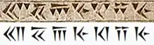 Inscripción 1 de Niebuhr, con las supuestas palabras para "Rey" (𐎧𐏁𐎠𐎹𐎰𐎡𐎹) resaltadas. Ahora sabemos que dice "Darío el Gran Rey, Rey de Reyes, Rey de países, hijo de Histaspes, un aqueménida, que levantó este palacio".[15] Conocida como DPa (foto), aparece sobre las figuras del rey y sus cortesanos en el palacio de Darío en Persépolis.[16]
