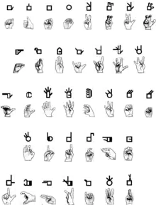 Estas formas básicas se modifican con líneas que sobresalen de sus caras y esquinas para representar dedos que no están posicionados como se ha descrito anteriormente. Las rectas representan los dedos rectos; líneas curvadas para dedos curvados; líneas enganchadas para dedos enganchados; líneas de ángulo recto, para dedos doblados en una sola articulación; y líneas cruzadas, para los dedos cruzados, como se muestra en la tabla a la derecha.