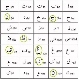 ![]() Consonantes del pegón. Las letras no presentes en el alfabeto árabe están marcadas con un círculo amarillo. | ||
