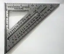 Una escuadra rápida es una escuadra de carpintero triangular que combina las funciones de escuadra combinada, escuadra de comprobación y escuadra de enmarcado en una sola herramienta. Se puede utilizar para calcular y marcar ángulos, para suspender una plomada y como guía para una sierra circular.[17][18][19] |