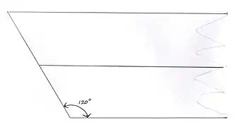 - El larguero de este ejemplo tiene dos escalones intermedios, incorporando un ligero voladizo (denominado albardilla). También se ha dejado libre el espacio vertical entre escalones sucesivos (es decir, no se ponen los tablones de contrahuella). Por último, a la parte inferior del larguero se le debe cortar una tira con el grosor de la tabla usada para los peldaños. Una vez cortada, esta pieza se convierte en la plantilla con la que se recortan los largueros restantes.
