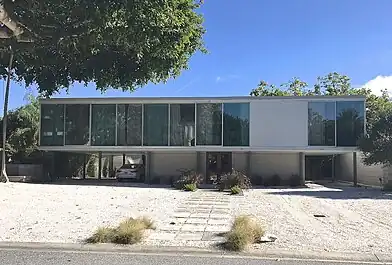 Ralph Twitchell es ampliamente reconocido como el fundador de la "Escuela Sarasota".[8][9] Fue uno de los primeros arquitectos en experimentar con técnicas de construcción de hormigón reforzado ( lamolítico ). Su enfoque arquitectónico orgánico-moderno fue influenciado por los diseños de la casa Usonia de Frank Lloyd Wright: diseño abierto, voladizos, ventanas de cristal, calefacción solar pasiva y enfriamiento natural. Sarasota demostró ser un clima particularmente adecuado para la arquitectura de planta abierta.[10][11]