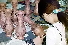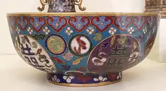 Desde Bizancio o el mundo islámico la técnica llegó a China en los siglos XIII-XIV; la primera referencia escrita se encuentra en un libro de 1388, donde es denominada "Objeto Dashi ('Musulmán')". No ha sido posible identificar objetos chinos del siglo XIV, la piezas más antiguas corresponden al reinado del emperador Xuande (1425–35), las cuales sin embargo muestra un uso acabado de los estilos chinos, lo que indicaría una experiencia considerable en la técnica.[14] Inicialmente fue recibida con desconfianza por los cultores del arte chinos, por ser extranjero, y por parecer estar orientada al gusto femenino. Sin embargo desde principios del siglo XVIII el emperador Kangxi contaba con un taller de cloisonné entre las numerosas fábricas imperiales. Las piezas chinas más elaboradas y preciadas son de comienzos de la dinastía Ming, especialmente los reinados del emperador Xuande y el emperador Jingtai (1450–57), aunque las piezas del siglo XIX o modernas son mucho más frecuentes. La industria china parece haberse beneficiado con el aporte de varios refugiados bizantinos que huyeron en la Caída de Constantinopla en 1453, aunque solo basado en el nombre, es mucho más probable que los chinos adquirieron este conocimiento del Medio Oriente. En gran parte del cloisonné chino el azul es el color predominante, y la denominación china de la técnica es, jingtailan ("objetos Jingtai azules"), que se refiere a este hecho, y al emperador Jingtai. La calidad comenzó a disminuir en el siglo XIX. Inicialmente se utilizaban recipientes o figuras pesadas de bronce o latón, y los alambres se soldaban, pero posteriormente se utilizaron recipientes de cobre mucho más livianos, con el alambre pegado antes de la cocción.[15][16] Las composiciones de los esmaltes y los pigmentos variaban según las modas.