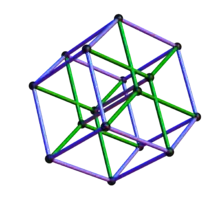 Cada vértice del politopo de cruce[16] tiene, para algunos k, la coordenada xk igual a ±1 y todas las demás coordenadas iguales a 0 (tal que es el k-ésimo vector de la base estándar incluido su signo). Se obtiene un poliedro conjugado del hipercubo. Como un subconjunto de n dimensiones, se puede describir con una única desigualdad que utiliza la operación valor absoluto: