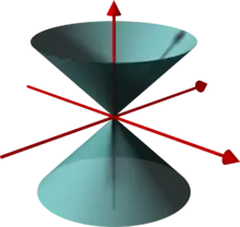 Si la forma cuadrática es indefinida, un espacio pseudoeuclídeo tiene un cono recto de vectores nulos dado por {x:q(x)=0}. Cuando el espacio pseudoeuclídeo proporciona un modelo del espacio-tiempo (véase más abajo), el cono nulo se llama cono de luz del origen.