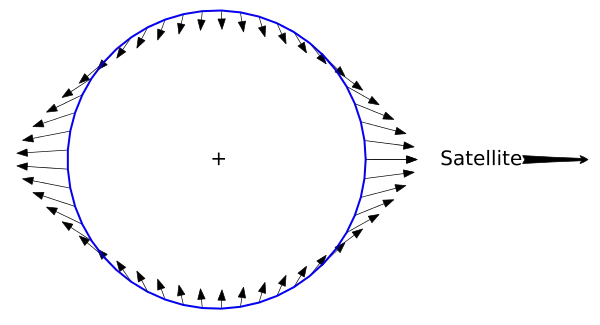 Fuerzas de marea actuando sobre un objeto esférico en un campo gravitatorio no homogéneo. En la imagen, el efecto se origina por una fuente a la derecha del diagrama. Flechas más largas indican fuerzas más fuertes.