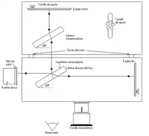 Este instrumento está basado en el principio del interferómetro de Michelson, que funciona del siguiente modo: la radiación primero golpea a un divisor o separador que escinde el haz de la luz en dos partes iguales (espejo semirreflejante). Estos dos haces de luz interfieren en el divisor después en su viaje de vuelta cuando son reflejados sobre otros dos espejos. Uno dispuesto frente a la trayectoria del haz original (espejo móvil 1) y el otro perpendicular (espejo fijo 2). En esta trayectoria se dispone la muestra y a continuación el detector IR (ver figura)
