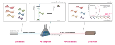 Existe una amplia gama de enfoques experimentales para medir los espectros de absorción. La disposición más común es dirigir un haz de radiación generado hacia una muestra y detectar la intensidad de la radiación que la atraviesa. La energía transmitida se puede utilizar para calcular la absorción. La fuente, la disposición de la muestra y la técnica de detección varían significativamente según el rango de frecuencia y el propósito del experimento.