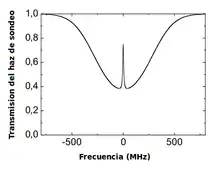 Sin embargo al introducir el haz de bombeo, se obtiene un máximo mucho más definido, también conocido como pico de Lamb, en honor al científico Willis Eugene Lamb (Figura 3). Este pico proporciona directamente la frecuencia de la transición atómica.
