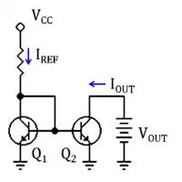 En electrónica, un espejo de corriente es una configuración con la que se pretende obtener una corriente constante, esto es, una fuente de corriente. Esta configuración consta de dos transistores, idealmente idénticos, y una resistencia o potenciómetro, si se quisiera regular el circuito en el caso de que los transistores no fueran idénticos. En la figura 1 se muestra el esquema básico de un espejo de corriente.