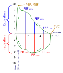 En la espirometría forzada se muestra la velocidad del flujo de aire en función del volumen pulmonar, y se obtienen:[4]