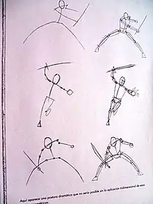 La manera más habitual es dibujar antes que nada las líneas de dirección del personaje, es decir, las líneas que definen la dirección de su tronco, piernas, brazos y cuello. Las articulaciones suelen representarse mediante círculos que unen las distintas líneas de dirección, mientras que el tronco se puede representar con un trapecio o dos triángulos y la cabeza con un óvalo.