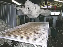 Una vez que se ha quitado todo el vellón de la oveja, el vellón se arroja, con el lado limpio hacia abajo, sobre la denominada "mesa de lana" en un sector del galpón (comúnmente conocido en los cobertizos de Nueva Zelanda y Australia como rouseabout o rousie). El tablero de la mesa de lana consta de listones separados aproximadamente 12 cm. Esto permite que los trozos cortos de lana, las cerraduras y otros desechos se acumulen debajo de la mesa por separado del vellón. A continuación, el vellón es bordeado por uno o más rodillos de lana para eliminar los fribas de sudor y otras partes menos deseables del vellón. Las piezas extraídas consisten en gran parte en lana más corta, sin semillas, con rebabas o polvorienta, que sigue siendo útil en la industria. Como tales, se colocan en contenedores separados y se venden junto con lana de vellón. Otros elementos retirados del vellón sobre la mesa, como heces, fragmentos de piel o ramitas y hojas, se desechan a poca distancia de la mesa de lana para no contaminar la lana y el vellón.
