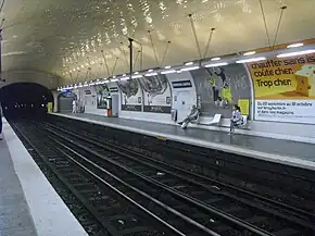 Está diseñada en bóveda elíptica revestida completamente de los clásicos azulejos blancos biselados del metro parisino. Su iluminación sigue el estilo New Neons, originaria de la línea 12 pero que luego se ha ido exportando a otras líneas. Emplea delgadas estructuras circulares, en forma de cilindro, que recorren los andenes proyectando la luz tanto hacia arriba como hacia abajo. Finos cables metálicos dispuestos en uve sostienen a cierta distancia de la bóveda todo el conjunto.