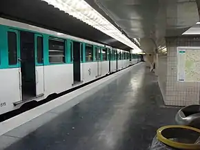 ![]() Un tren detenido en la estación. Se puede observar los azulejos y la iluminación empleada. | |||||||||