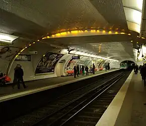 Está diseñada en bóveda elíptica revestida completamente de los clásicos azulejos blancos biselados del metro parisino, con la única excepción del zócalo que es de color marrón. Los paneles publicitarios emplean un fino marco dorado con adornos en la parte superior.