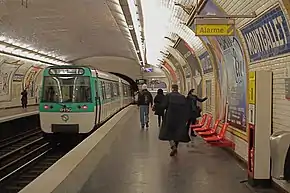 Está diseñada en bóveda elíptica revestida completamente de los clásicos azulejos blancos biselados del metro parisino, con la única excepción del zócalo que es de color marrón.Los paneles publicitarios emplean un fino marco dorado con adornos en la parte superior.