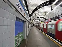 La actual estación de metro de Londres de tubo profundo se encuentra en la línea Victoria, que fue el primer gran proyecto subterráneo de la posguerra en el centro de Londres. La línea recibió la aprobación para extenderse desde Victoria debajo del Támesis hasta Vauxhall (y en adelante hasta Brixton ) en marzo de 1966. Para construir el hueco de la escalera mecánica, el suelo debajo de él se congeló con salmuera .[20] Los andenes de la estación fueron diseñados por Design Research Unit y decorados con un motivo de los Vauxhall Gardens del siglo XIX, diseñados por George Smith.[21][22] Al mismo tiempo, se reconstruyó el cruce de carreteras de Vauxhall Cross para dar cabida a la nueva estación de metro.[23] La estación de metro fue inaugurada el 23 de julio de 1971 por la princesa Alexandra, como parte de la extensión de la línea Victoria a Brixton.[11][21]