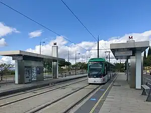 ![]() Una unidad del metro de Granada a su paso por la estación. | |||||||||