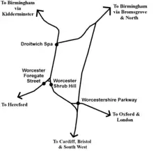 Worcester Shrub Hill cuenta con la ruta de West Midlands Trains desde Worcester hasta Birmingham, a través de Kidderminster y Stourbridge Junction. Esta línea va a Birmingham Snow Hill y Birmingham Moor Street, y muchos de los servicios continúan hasta Whitlocks End o Dorridge.[2] También hay un número limitado de trenes a través de Bromsgrove a Birmingham New Street que comienzan, terminan o hacen escala aquí, principalmente en las horas pico o temprano en la mañana o tarde en la noche. La mayoría de los servicios entre Hereford y New Street toman la ruta directa entre Foregate Street y Droitwich Spa para evitar la necesidad de una inversión.