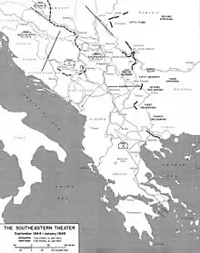 El mando alemán en Skopie no apoyó al Estado macedonio "independiente" cuando sus fuerzas se retiraron de la región. En medio del caos, solo trató de utilizar los "comités macedonios" recién formados como servicios de policía local. Sus miembros eran personas como Vasil Hadzhikimov, Stefan Stefanov, Spiro Kitinchev, Dimitar Gyuzelov y Dimitar Tchkatrov, todos ellos antiguos activistas de la OIRM, la Organización Revolucionaria Secreta de la Juventud de Macedonia y los Comités de Acción Búlgaros.[29] En el medio, a principios de octubre de 1944, tres ejércitos búlgaros bajo el liderazgo del nuevo gobierno prosoviético búlgaro,[30] junto con el Ejército Rojo, volvieron a entrar en la Yugoslavia ocupada.[31][32] Las fuerzas búlgaras entraron en Yugoslavia sobre la base de un acuerdo entre Josip Broz Tito y el líder partisano búlgaro Dobri Terpeshev firmado el 5 de octubre en Craiova, Rumanía, con la mediación de la URSS.[33]