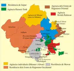 ![]() Agencia de Bikaner (al noroeste) dentro de la agencia de la Rajputana; Bikaner fue una de las dos agencias formadas solo por un principado. | |||||||||