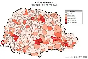 De los 399 municipios paranaenses, sólo dos tenían población superior a los quinientos mil habitantes: Curitiba, que es la capital, y Londrina, en el norte del estado. Otros dieciséis tenían entre 100.001 y 500.000 (Maringá, Ponta Grossa, Cascavel, São José dos Pinhais, Foz do Iguaçu, Colombo, Guarapuava, Paranaguá, Araucária, Toledo, Apucarana, Pinhais, Campo Largo, Arapongas, Almirante Tamandaré, Umuarama, Piraquara y Cambé), catorce de 50.001 a 100.000, 55 de 20.001 a 50.000, 109 de 10.001 a 20.000, 105 de 5.001 a 10.000, 93 de 2001 a 5.000 y cinco hasta dos mil (Esperança Nova, Miraselva, Santa Inês, Nova Aliança do Ivaí y Jardim Olinda).[60]