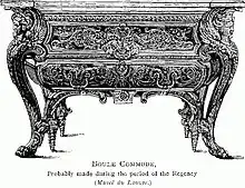 - El escritorio (bureau) se genéraliza; habitualmente en maderas oscuras (noirci), el borde de la superficie de trabajo en bronce y recubierta de cuero fino, las patas curvadas y decorado con bronce (le plateau droit cerné de bronze recouvert d'un maroquin, pieds galbés et décor en bronze).