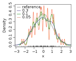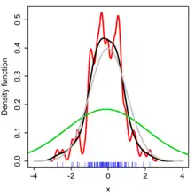 El ancho de banda del kernel es un parámetro libre que influye mucho en la estimación resultante. Para ilustrar su efecto, tomamos una muestra aleatoria simulada de la distribución normal estándar (representada en los picos azules del rug plot en el eje horizontal). La curva gris es la densidad real (una densidad normal con media 0 y varianza 1). En comparación, la curva roja está poco suavizada, ya que contiene demasiados datos espurios debido a la utilización de un ancho de banda h = 0,05, que es demasiado pequeño. La curva verde está demasiado suavizada, ya que el ancho de banda h = 2 oculta gran parte de la estructura subyacente. La curva negra con un ancho de banda de h = 0,337 se considera óptimamente suavizada, ya que su estimación de la densidad se aproxima a la densidad real. Una situación extrema se da en el límite (sin suavizado), donde la estimación es una suma de n funciones delta centradas en las coordenadas de las muestras analizadas. En el otro límite extremo la estimación conserva la forma del núcleo utilizado, centrada en la media de las muestras (completamente lisa).