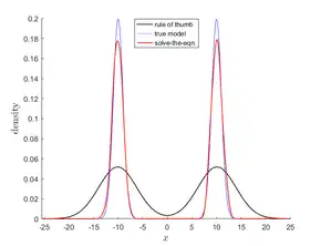 Esta aproximación se denomina aproximación de distribución normal, aproximación gaussiana o regla empírica de Silverman.[23] Aunque esta regla empírica es fácil de calcular, debe utilizarse con precaución, ya que puede dar lugar a estimaciones muy imprecisas cuando la densidad no se aproxima a la normalidad. Por ejemplo, al estimar el modelo de mezcla gaussiana bimodal: