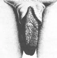Se designa alargamiento de los labios vaginales o estiramiento labial (también conocidos como Sinus pudoris o macronympha[6]) y aunque no de manera médica, como el delantal Khoikhoi o el delantal hotentote, son una característica de ciertos grupos khoisan, cuyos miembros femeninos desarrollan labios menores relativamente alargados, colgando hasta cuatro pulgadas fuera de su vulva cuando están de pie en una posición vertical. Aparentemente, la designación del "delantal" se obtuvo de la tendencia de las primeras descripciones europeas a identificar erróneamente el par de labios como un solo órgano ancho, que llamaron en francés un tablier o tablón.[7]