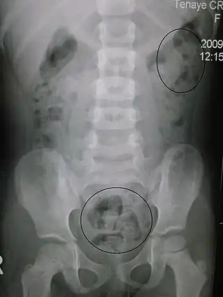 ![]() Estreñimiento visto a través de rayos X. Los círculos representan áreas de materia fecal (las heces están rodeadas de blanco debido al gas de los intestinos). | ||