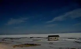 ![]() Vista a través del estrecho desde Green Island Brook (moonlight, marzo de 2005) (de izqda a dcha.: faro de Point Amour, isla de L'Anse-au-Loup e isla Capstan) | ||